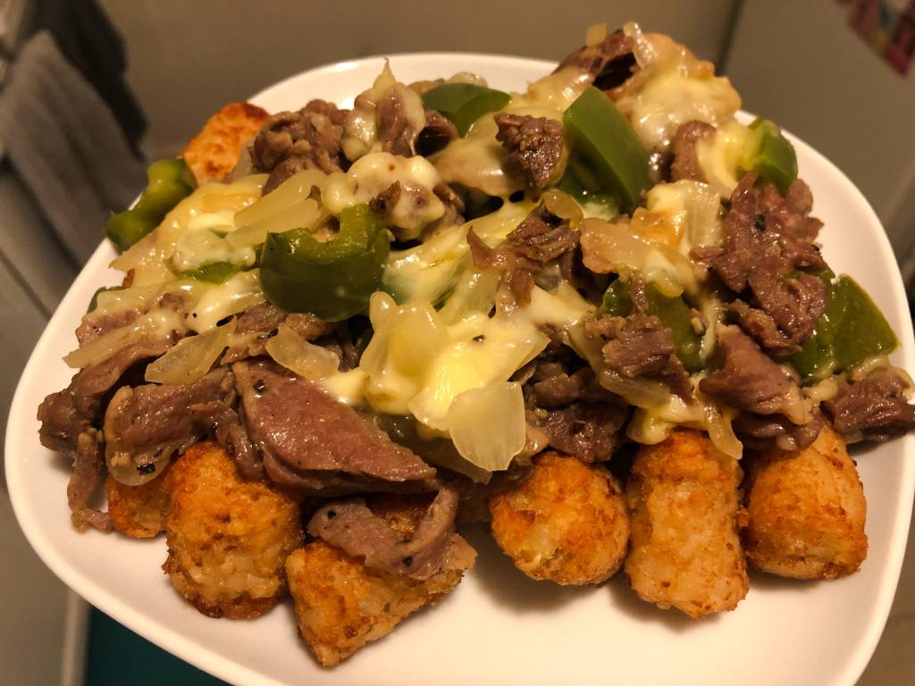 - Top the tots with this mess of cheesesteak and serve hot. Optionally serve with additional condiments like mayo, but I think ketchup or hot sauce would be safer options.