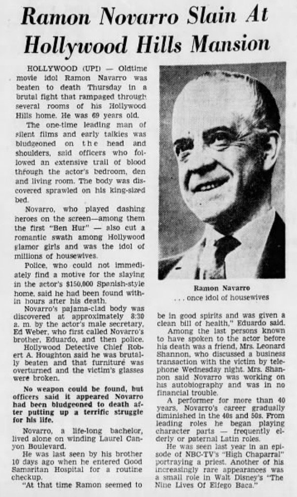 The man, like many others rattling around in Hollywood homes, was an aging actor whose star had dimmed. In the 1920’s he was a suave, romantic lead in silent pictures. It was a successful career that continued into the talking pictures of the 1930s. At his career peak, the man, “The Latin Lover”, was making $100k a picture, locking lips with the most famous actresses in the world: Norma Shearer, Myrna Loy, Joan Crawford, and Greta Garbo. His co-stars praised his acting skills, though he never won an Oscar. Friends would refer to him as a kind and gentle soul. Women admired his romantic on-screen persona and good looks. But his heyday of leading roles and an adoring public was long gone. His last leading role had been in 1934. His career decline was swift, exacerbated by poor studio choices and his alcoholism. Despite the permanent career slump, relegated to only picking up the occasional bit part on television shows like Bonanza, he had made good real estate investments, so he lived comfortably. He even had a private secretary. Granted, this secretary mostly just wrote checks to the sex workers (“hustlers”, as the male pros were called), and picked up the man’s booze orders. But hey, a living is a living. He also had a memoir in the works: attempting to capture the fascinating stories from his time as a star at MGM (being the first Latin American film star ever). But it would never come to be. When the secretary arrived for work that Halloween morning, he discovered the home had been ransacked and, more unfortunately, that his employer had been murdered. The press jumped on the story: Headlines on the front page in LA and NYC reading “Ramon Novarro, Silent Film Era Star, Beaten to Death”.